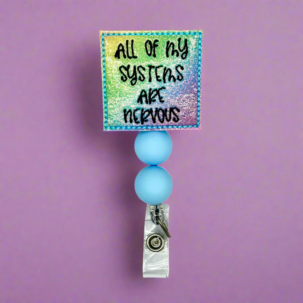 Keep your badge stylishly secure with our All my systems are nervous badge reel. Perfect for any quirky professional, this reel will show off your unique personality while keeping important items within reach. Say goodbye to boring lanyards and hello to a playful addition to any work outfit!