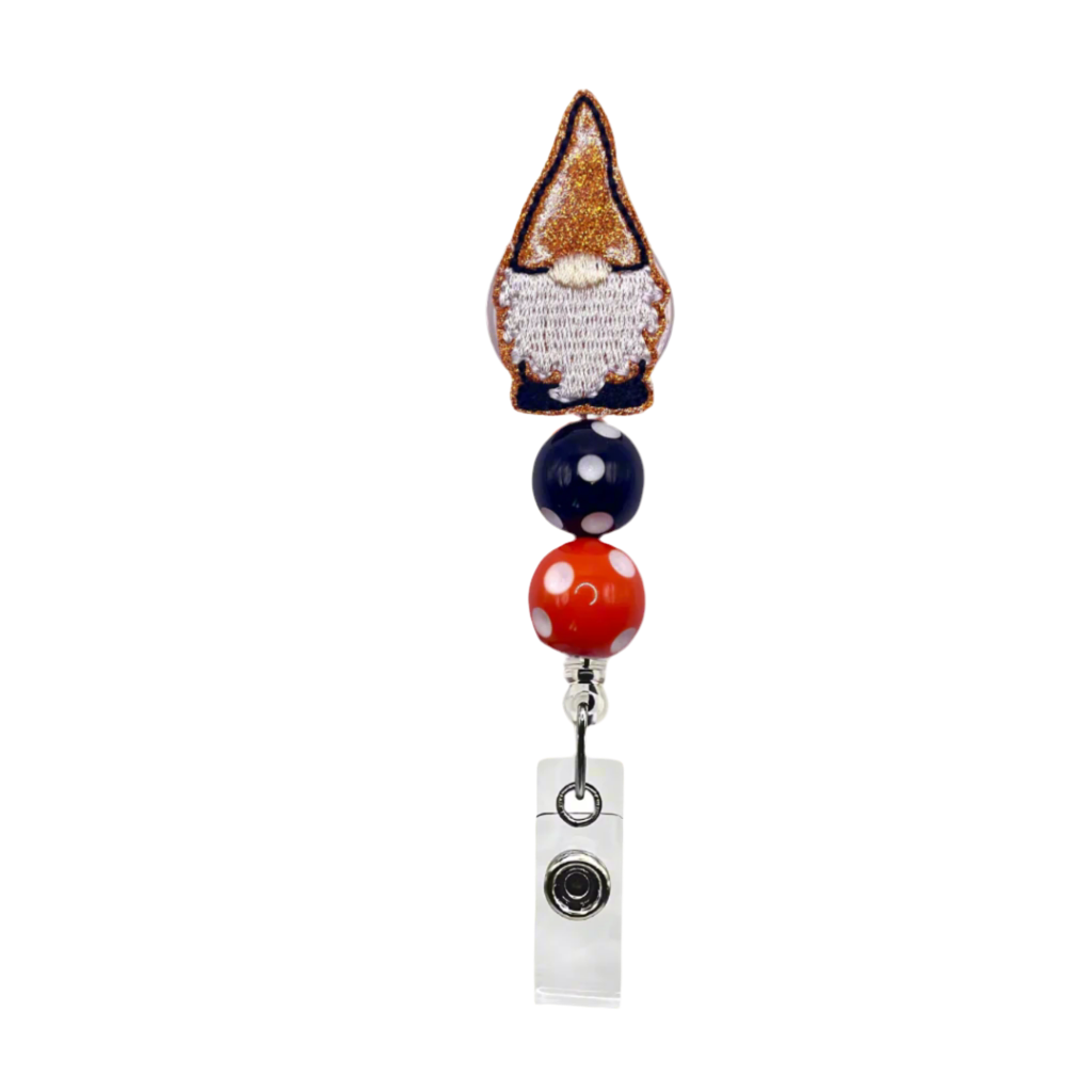 Make your workday a little more cheerful with this quirky Black and Orange Gnome Polka Dot Beaded Badge Reel! Featuring an orange and black feltie design and bold polka dot beads, this Badge Reel helps you add some personality to your work attire. Featuring a rotating clip and retractable cord, this reel offers easy access to your ID, making it perfect for Nurses, Teachers, or anyone who needs to quickly show their badge!