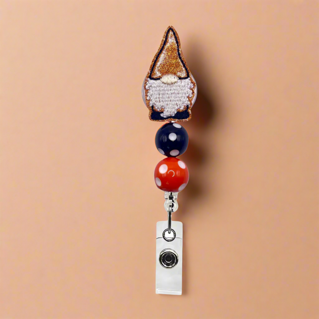 Black and Orange Gnome Polka Dot Beaded Badge Reel
