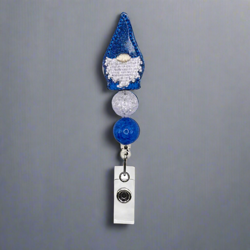 Add a touch of whimsy to your uniform with this delightful Blue and White Gnome Beaded Badge Reel. Featuring a charming felt gnome and a beaded motif in cheery blues and whites, it's a surefire conversation starter! Just clip it on and enjoy easy access to your ID badge