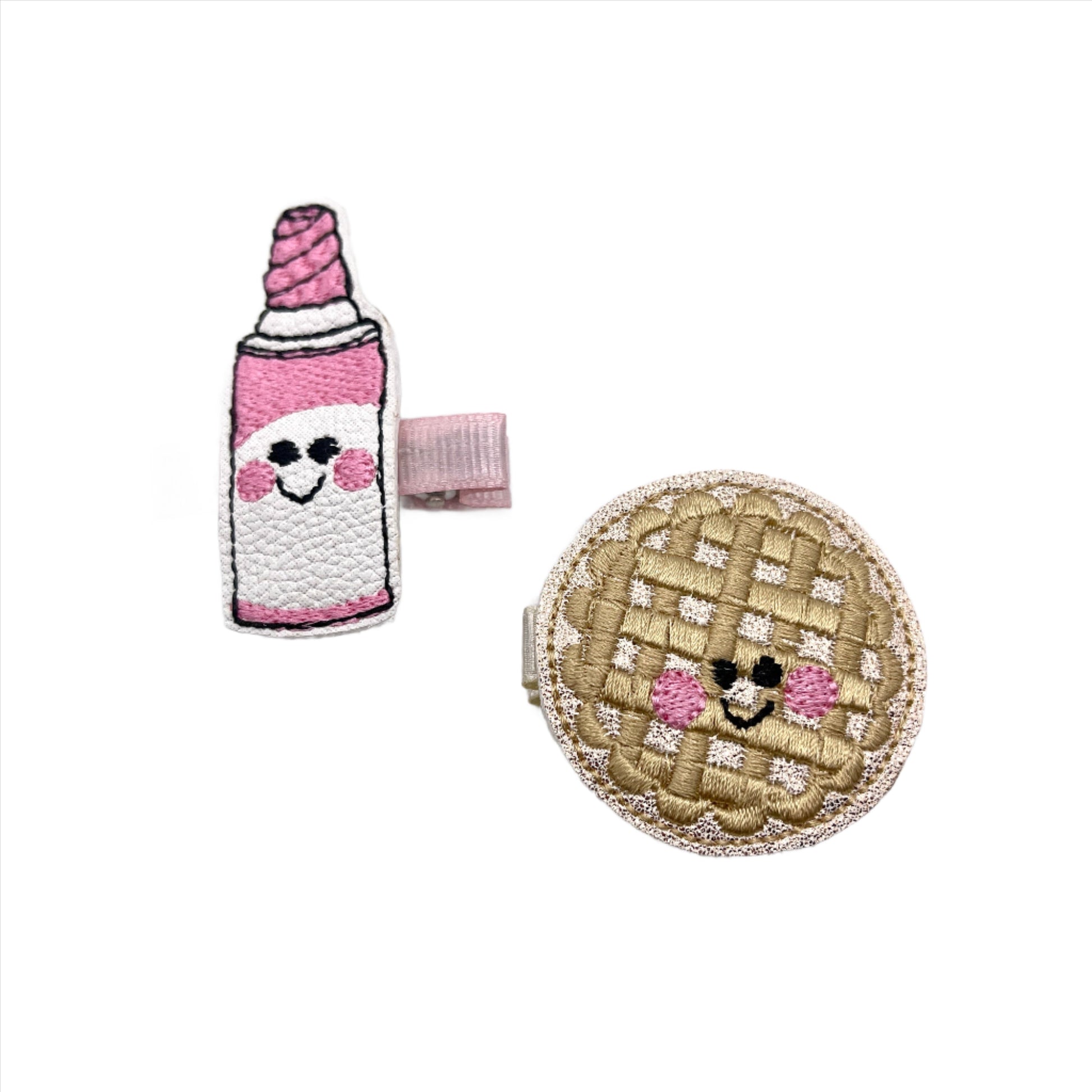 Handmade Hair clips with Pie and Whipped Cream Feltie set on ribbon covered alligator clips. They are the perfect hair accessory.