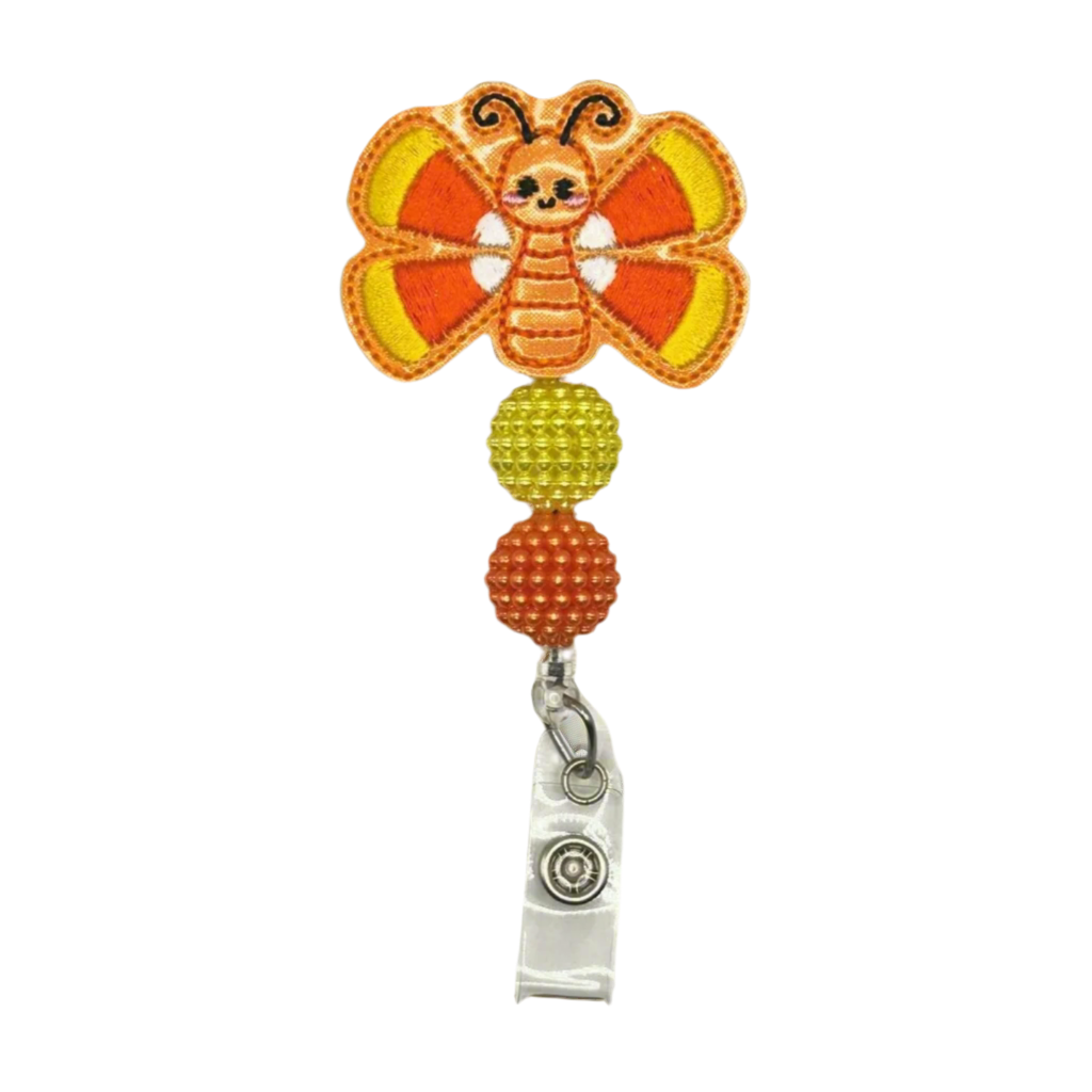 Flit through the office with this sweet Candy Corn Butterfly Badge Reel. Show off your love for autumn and whimsical style with this playful accessory. Perfect for adding a unique touch to your work uniform.