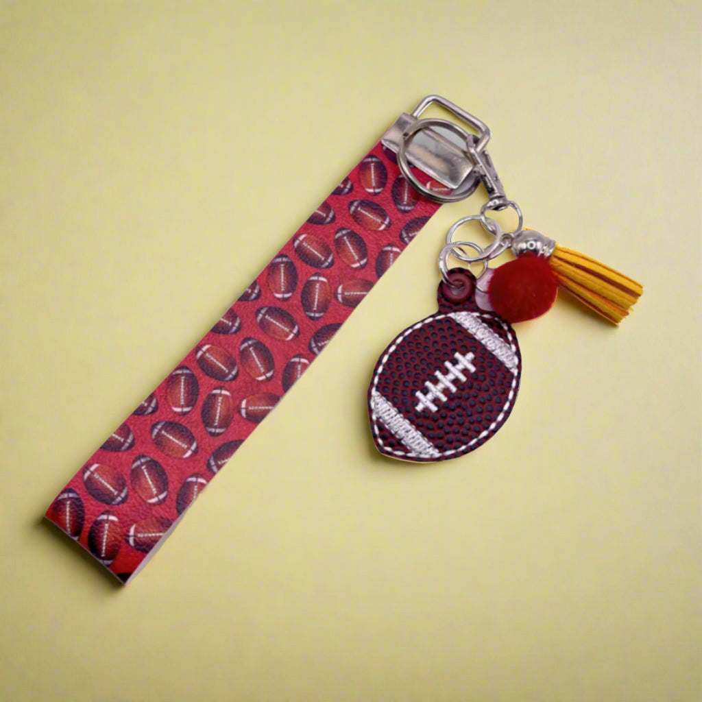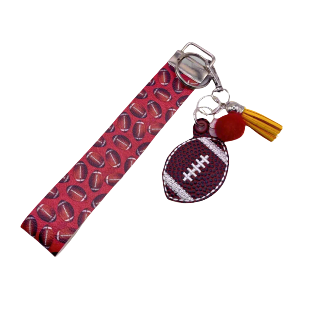 Don't fumble with regular keyrings anymore! Stay organized with this clever Red & Yellow Football Key Chain with Wristlet. This combo set is your one-stop-shop for all your key and fob carrying needs! Whether you're off to the big game, or just to the office, this wristlet keychain is sure to score big points. It'll keep you looking sharp with its fun football design, and have your friends kicking themselves for not owning one as well! So don't wait - grab a touchdown worth of keyring fun today!