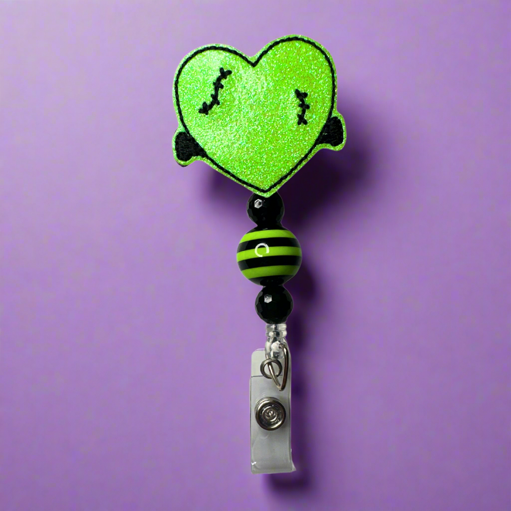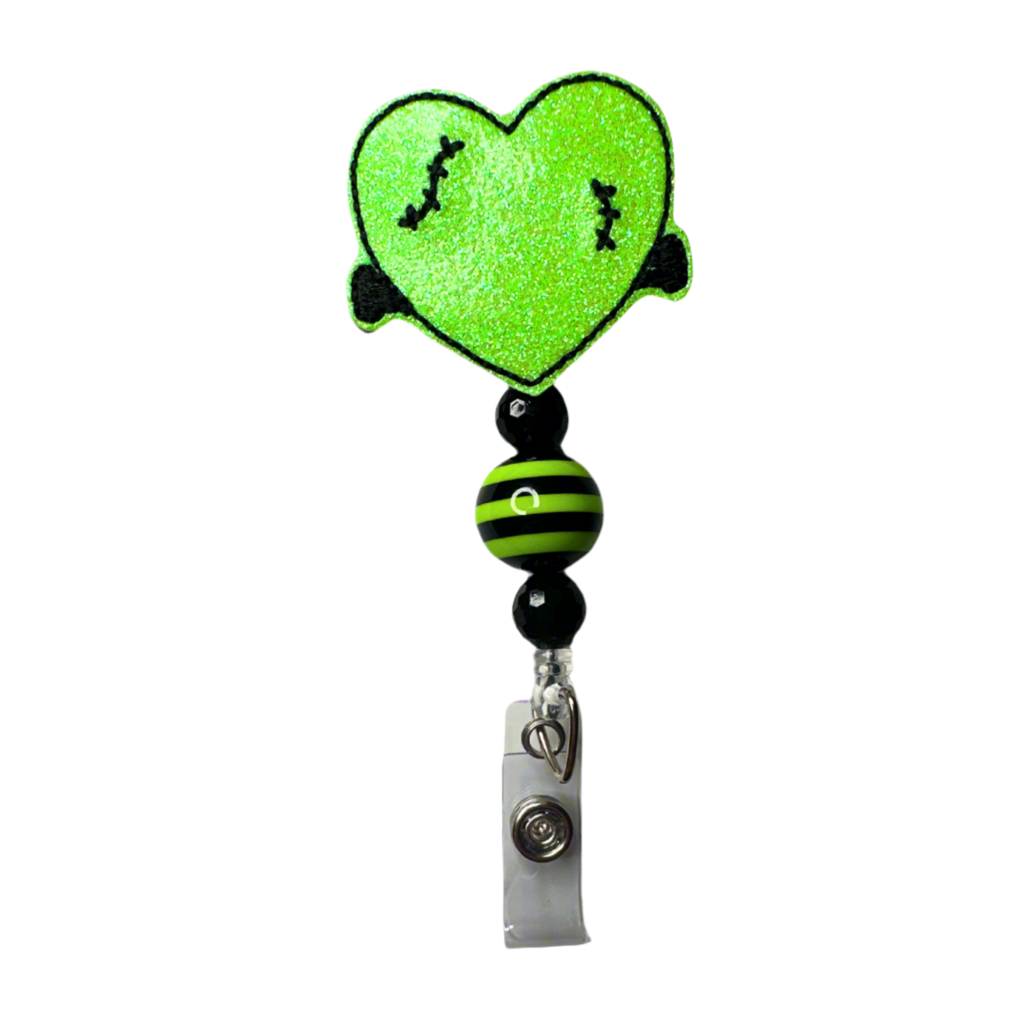 Unleash your inner monster with the Franken Hearts Badge Reel! This unique badge reel features a playful Frankenstein heart design and is adorned with black and green beads. Show off your quirky side with this fun accessory!