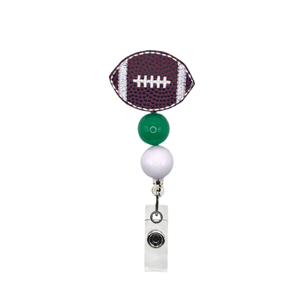 Support your favorite Football team with this football feltie badge reel with green and white beads.