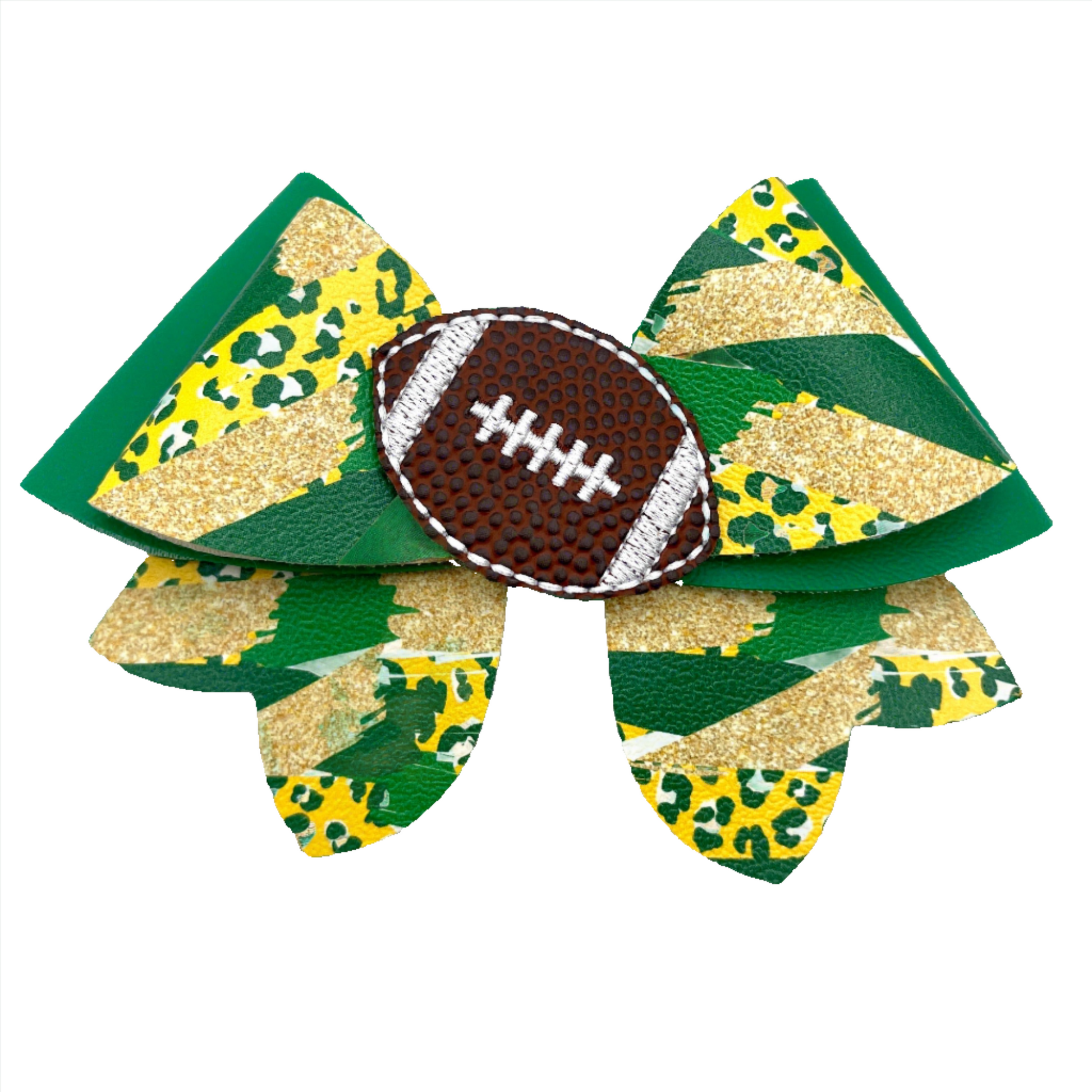 Heart shaped football feltie on a bow made with vegan leather. The bow leather has a fun green and yellow brushstroke design. It all comes together on a French barrette.
