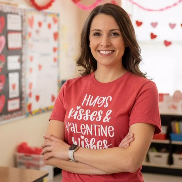 Upgrade your wardrobe with our Hugs, Kisses, and Valentine Wishes T-Shirt! This red, berry, or aqua T-shirt is made out of high quality super soft Tri-Blend material and the Hugs, Kisses, and Valentine Wishes print adds an unique and eye-catching touch to the shirt.
