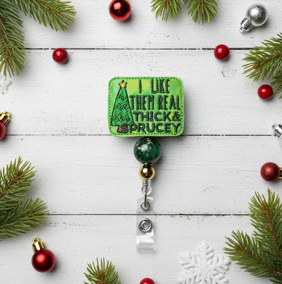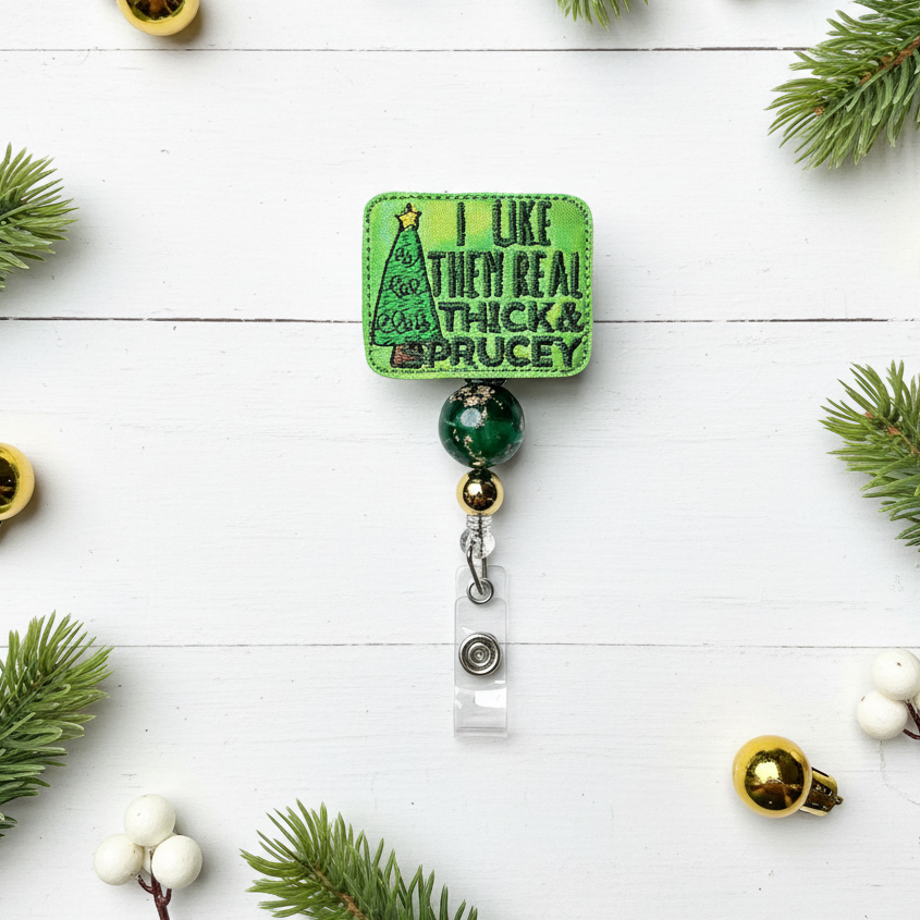 Get in the holiday spirit with our I Like Them Real Thick and Sprucey Christmas Tree Beaded Badge Reel! This unique badge reel features a festive Christmas tree design and is sure to add some charm to your work attire. Be the talk of the office with this quirky and playful accessory.