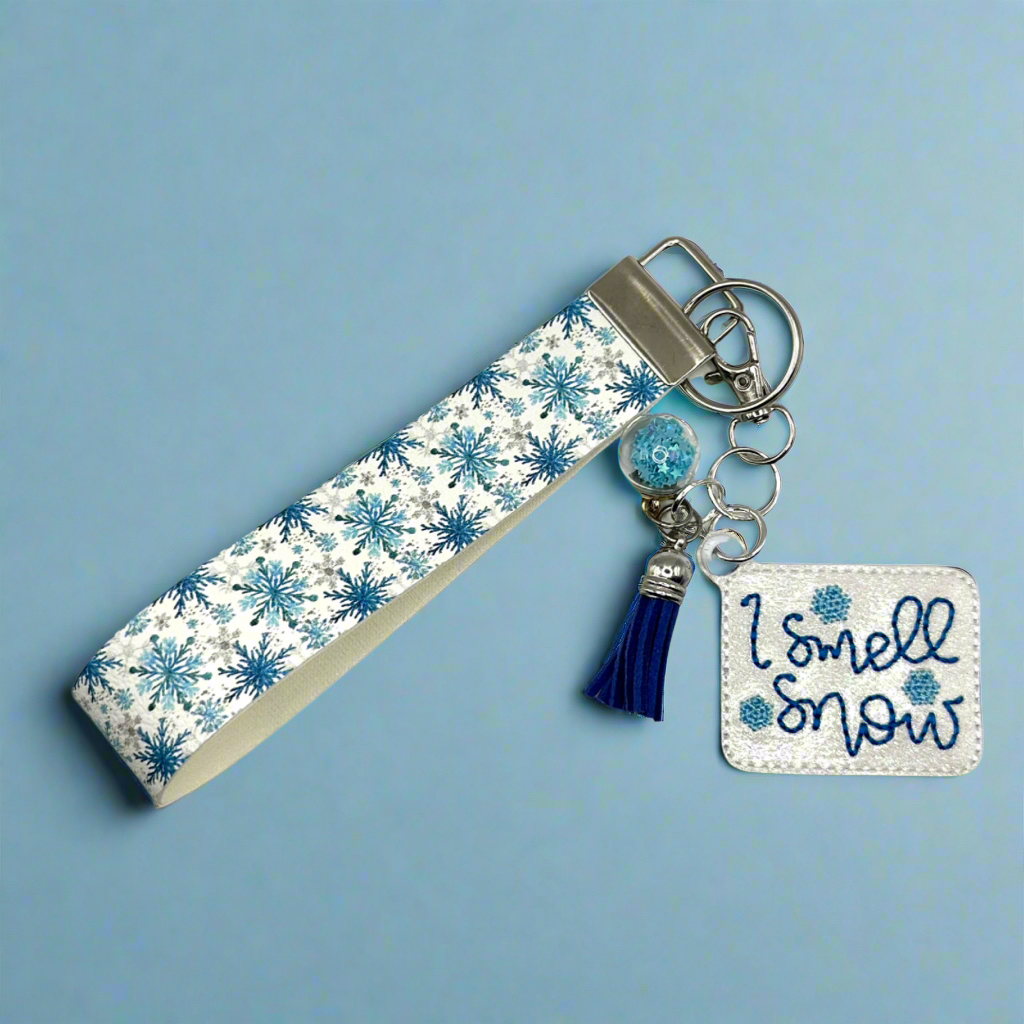 Celebrate the Winter season with this I Smell Snow keychain and wristlet! Featuring an I smell Snow feltie keychain and snow flake print vegan leather wristlet. The item is completed with blue tassel and blue charm ball.