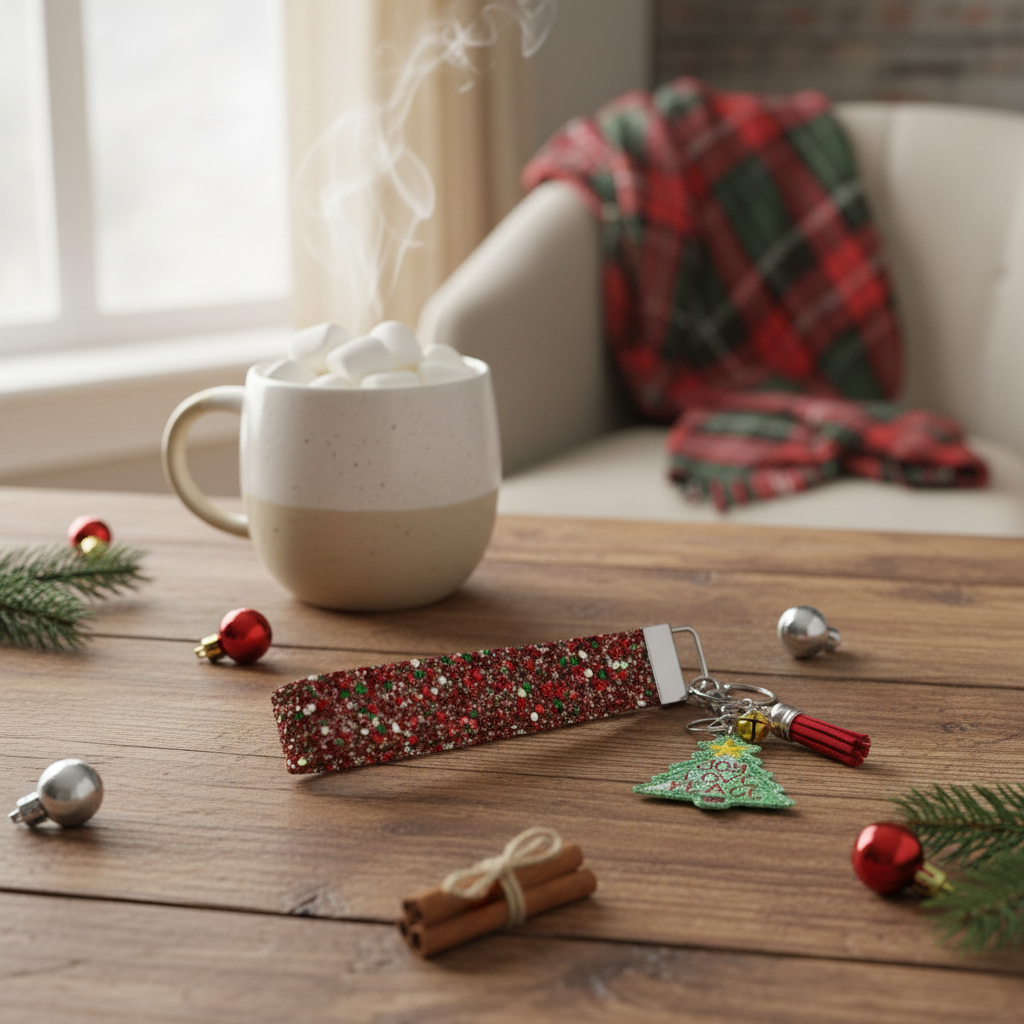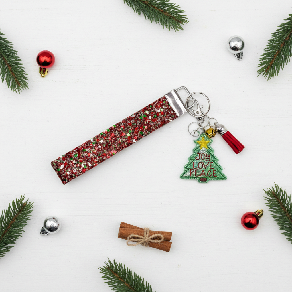 Add some holiday cheer to your daily routine with our Joy, Love, Peace Tree feltie keychain and red, green, and white glitter wristlet. This festive set features a red tassel and gold bell charm, giving it an extra special touch. The wristlet is made from high-quality free glitter material, ensuring that it is both sparkly and sustainable.