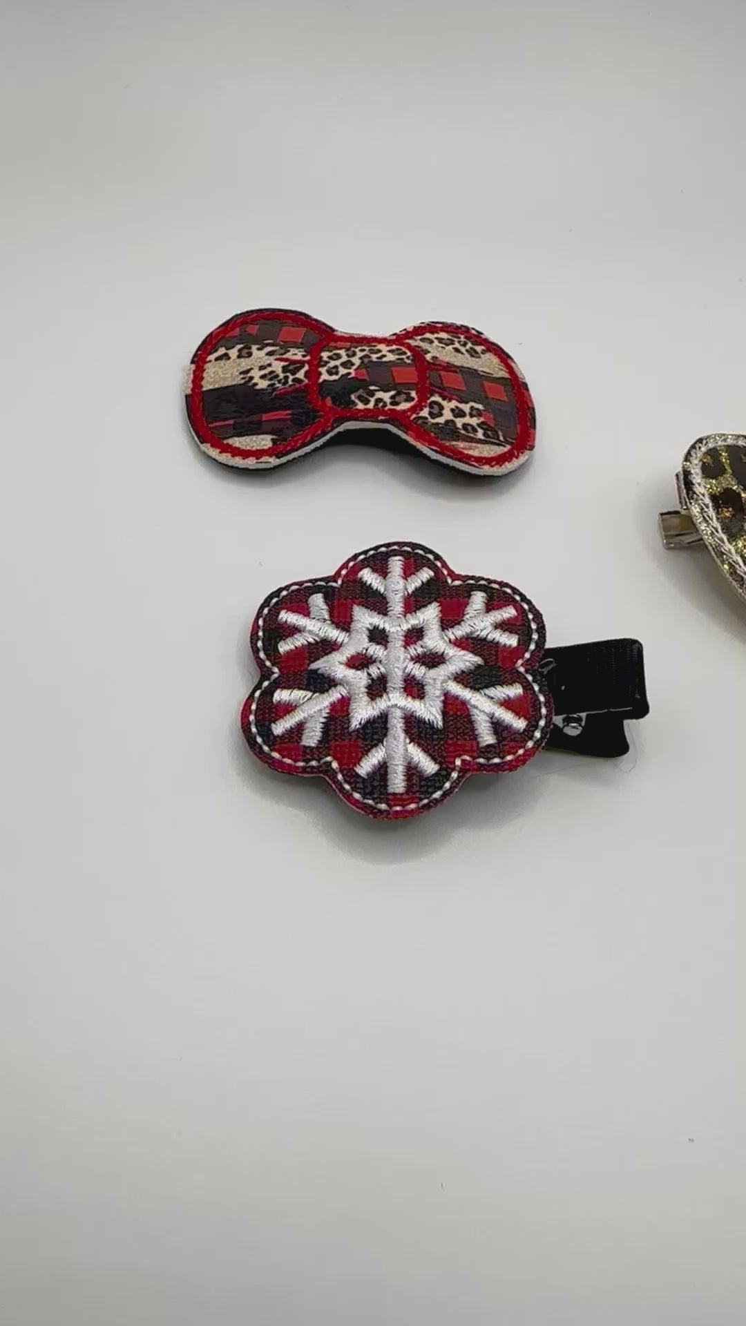 Handmade Hair clips with leopard heart, snow flake and leopard bow felties. Comes in a set of three. The snowflake has a ribbon covered alligator clip, the bow and the heart have a snap clip.