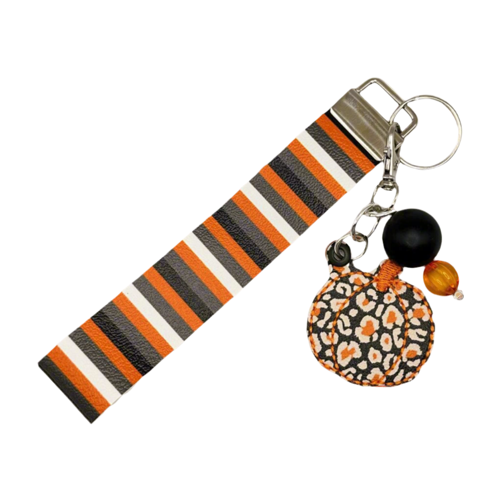 This Leopard Pumpkin Keychain and Wristlet will have you feeling festive all season long! The Leopard Pumpkin Feltie Keychain is incredibly soft and adorable, making it the perfect accessory for your purse, backpack, or keys! The wristlet is made of a fall-colored striped vegan leather, and is decorated with black and orange beads - the perfect combination for a cozy autumn look. Featuring a removable Keychain and a fun, stylish wristlet, you'll find yourself wanting to take this keychain and wristlet with you everywhere you go!