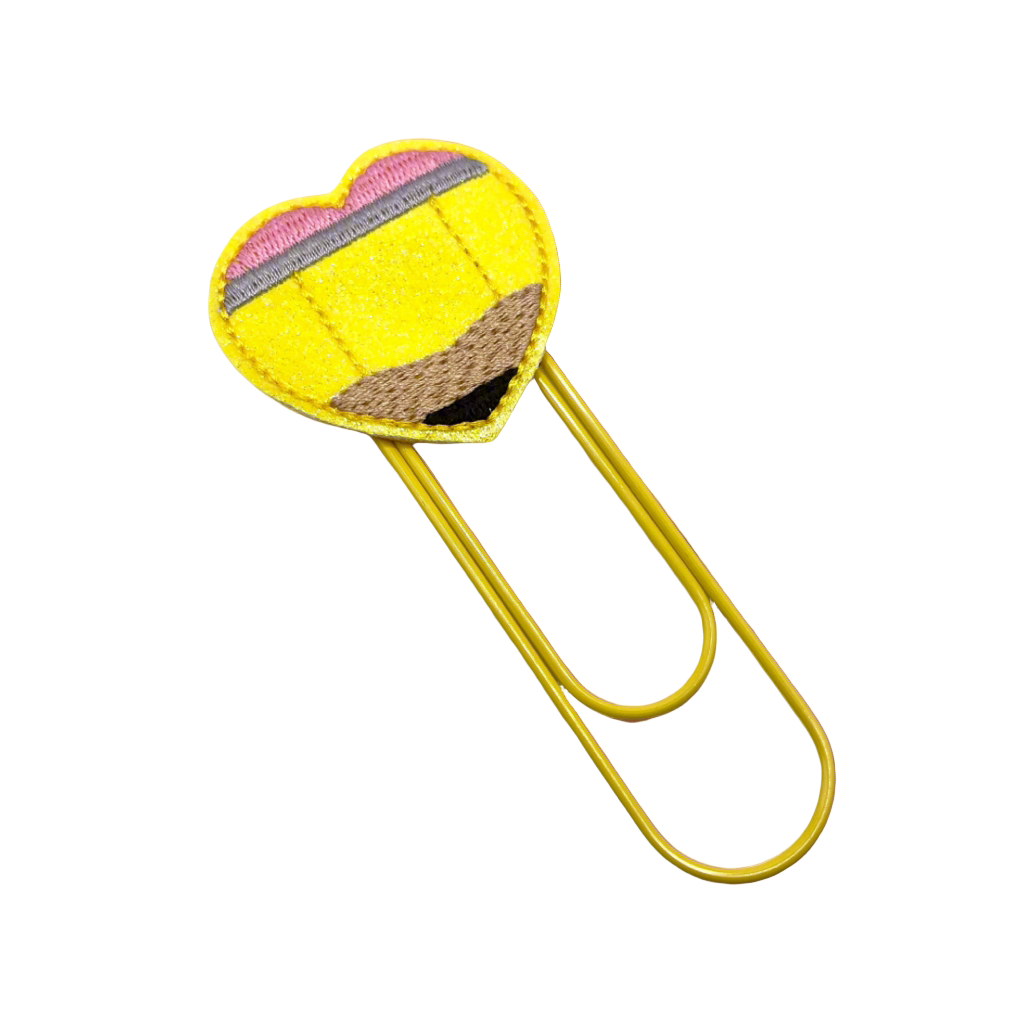 Keep your documents organized with this pencil heart oversized Paper Clips. Featuring a yellow pencil heart feltie on a large 4 inch size yellow paperclip.