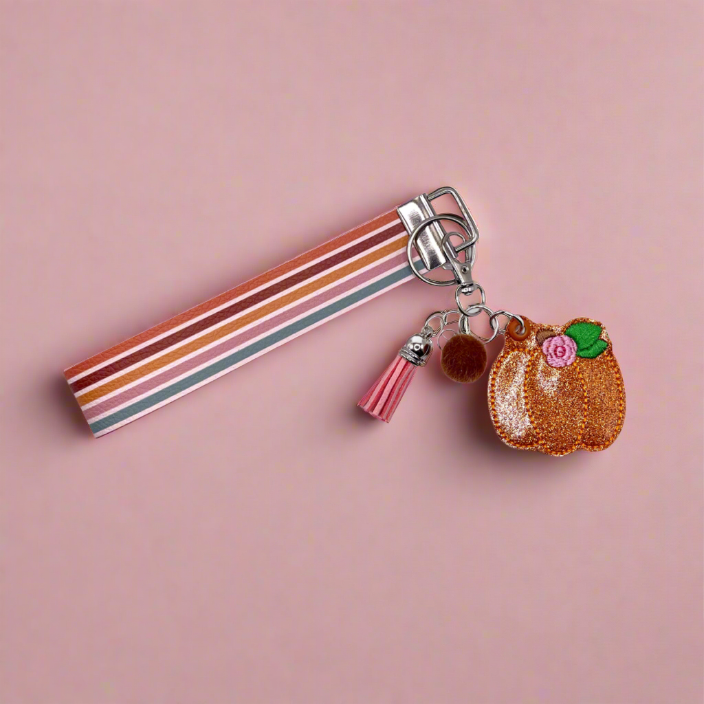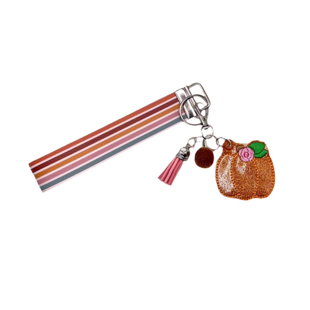 Carry your keys in style this autumn with this fun and cute Pink Flower Pumpkin Keychain and Wristlet! This set features a feltie pumpkin keychain, a fall color wristlet, a pink tassel, a brown pom pom for all your seasons needs. Add a bit of flair and whimsy to your everyday life!