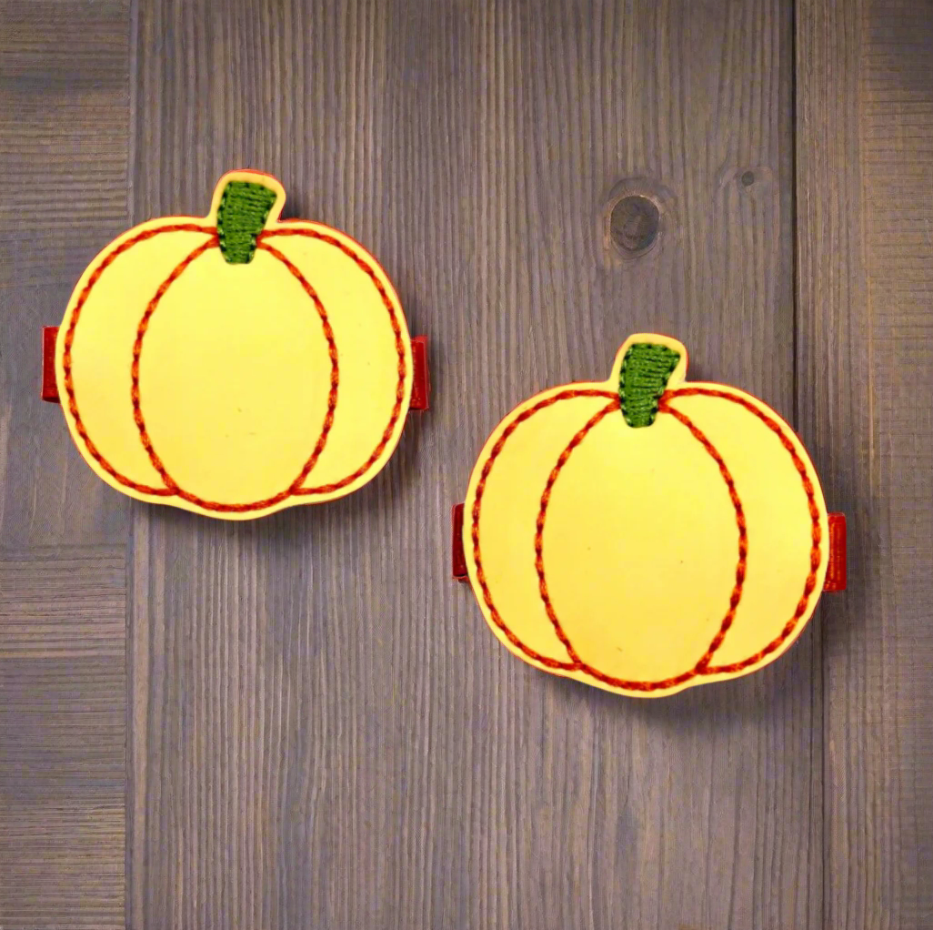 Handmade hair clips with Glow in the dark Pumpkin Feltie with a ribbon covered alligator clip. Comes in a set of 2. Adorable for any hair style and perfect to keep hair back for little ones without much hair.