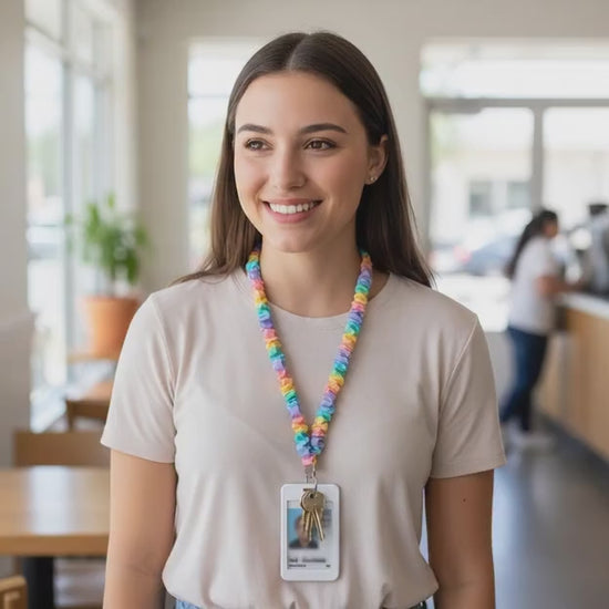 Add a splash of color and fun to your everyday with the Rainbow Polka Dot Scrunchie Lanyard. This playful accessory keeps your essentials close while adding a cheerful touch to your look. Its breakaway feature ensures safety, making it perfect for school, work, or casual outings. Comfortable to wear and easy to style, this lanyard brightens up any day with its vibrant rainbow polka dots.