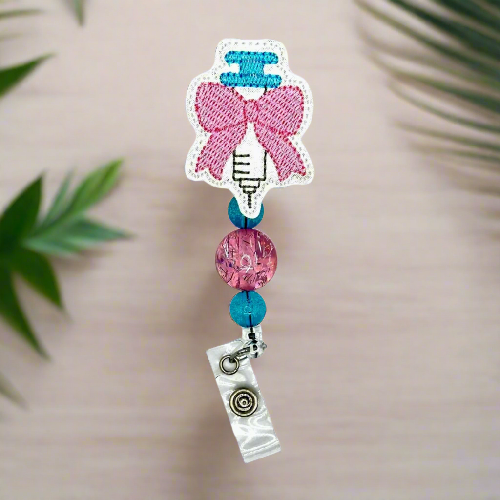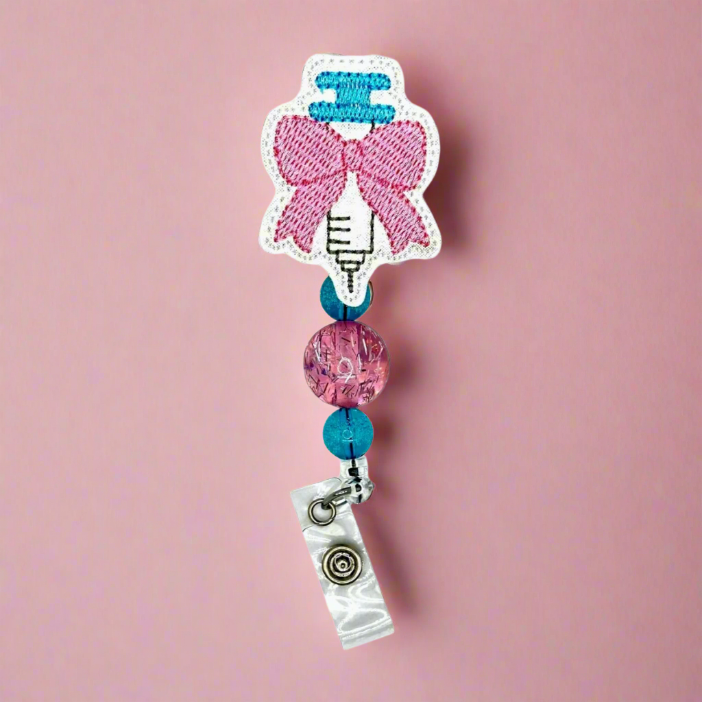 Give your work outfit a playful touch with our Syringe with Bow Badge Reel! This quirky accessory is both functional and stylish, featuring a cute bow design on a syringe shaped badge holder. Stay organized and have fun with this unique addition to your daily routine.
