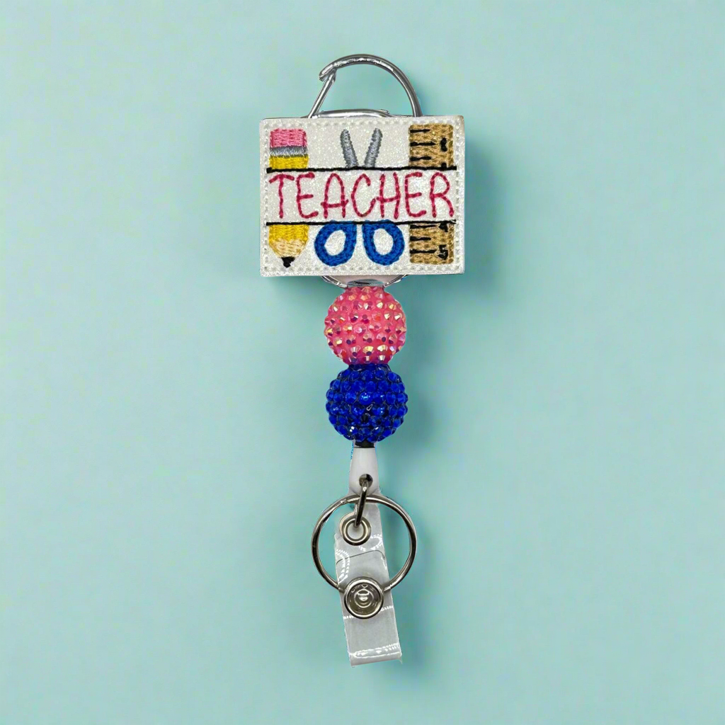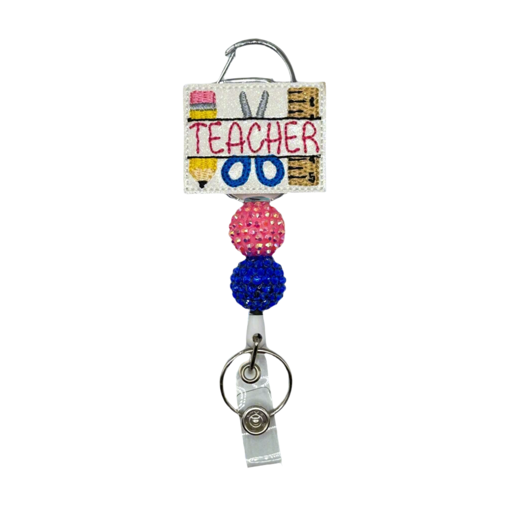 Rock this Teacher With Supplies Badge Reel to show off your teaching pride! Keep your ID or keys easily accessible while adding a touch of fun to your outfit. The perfect gift for any educator.