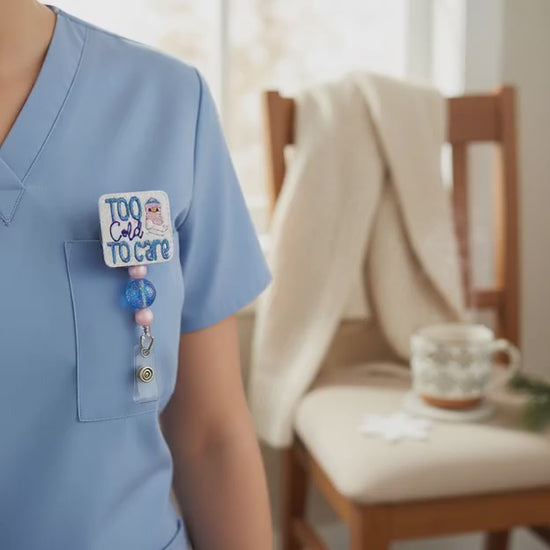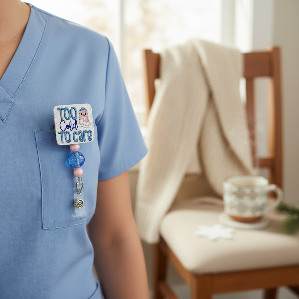 Stay cool and stylish with the Too Cold To Care Badge Reel. This playful accessory not only holds your ID badge securely, but also showcases your carefree attitude. With a quirky play on words, this badge reel is perfect for those who don't take themselves too seriously.