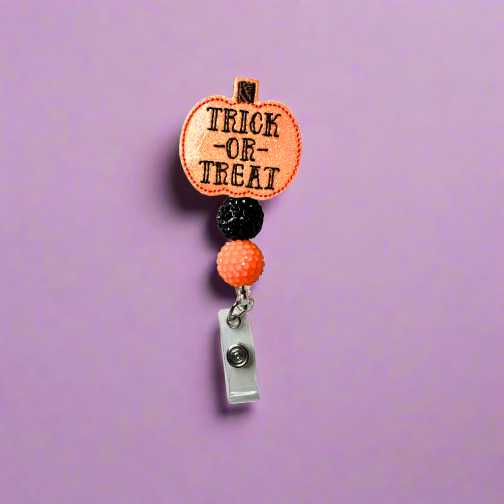Elevate your Halloween costume with our Trick or Treat Pumpkin Beaded Badge Reel. No more dull ID holders - this playful accessory will add some spooktacular flair to your work day (or trick or treating adventures).