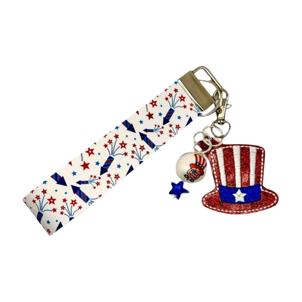 Get ready to show off your patriotic side with the Uncle Sam Hat Keychain and Wristlet! This keychain features a charming Uncle Sam feltie while the wristlet boasts a festive fireworks print, perfect for celebrating Independence Day. Keep your keys and essentials secure in style.