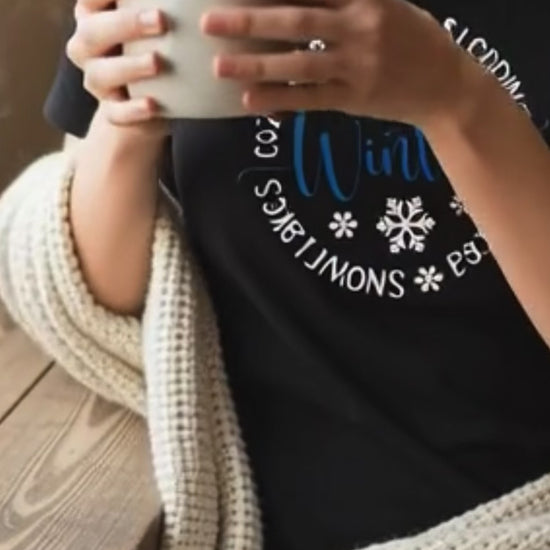 Celebrate Winter with this Winter Circle T-Shirt! This aqua T-shirt is made out of high quality super soft Tri-Blend material and blue Winter and white Cozy Blankets, Sledding, Hot Cocoa and Snowflakes circle print adds an unique and eye-catching touch to the shirt.